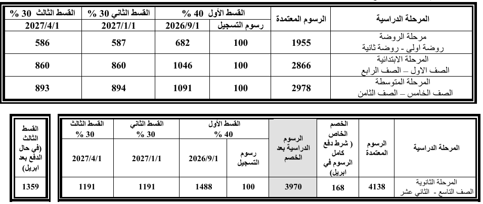 الرسوم الدراسية للعام الدراسي 2027/2026: